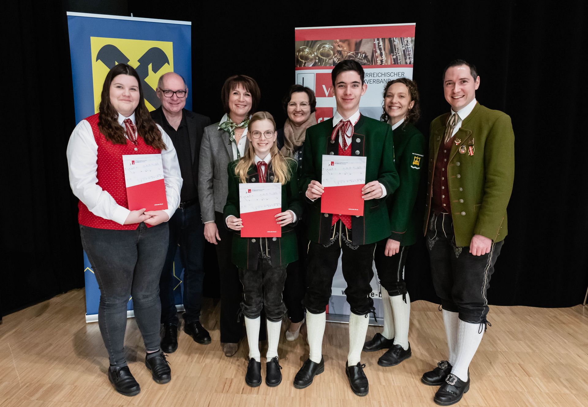 Vier junge Musiker*innen, die im vergangenen Jahr das Jungmusikerleistungsabzeichen erfolgreich abgelegt hatten, wurden im Zuge des Konzerts offiziell in die Kapelle aufgenommen. Konkret handelt es sich um Antonia Ortner auf der Querflöte, Magdalena Ecker am Tenorhorn und die beiden Hornisten Lukas Erdpresser und David Forstner.