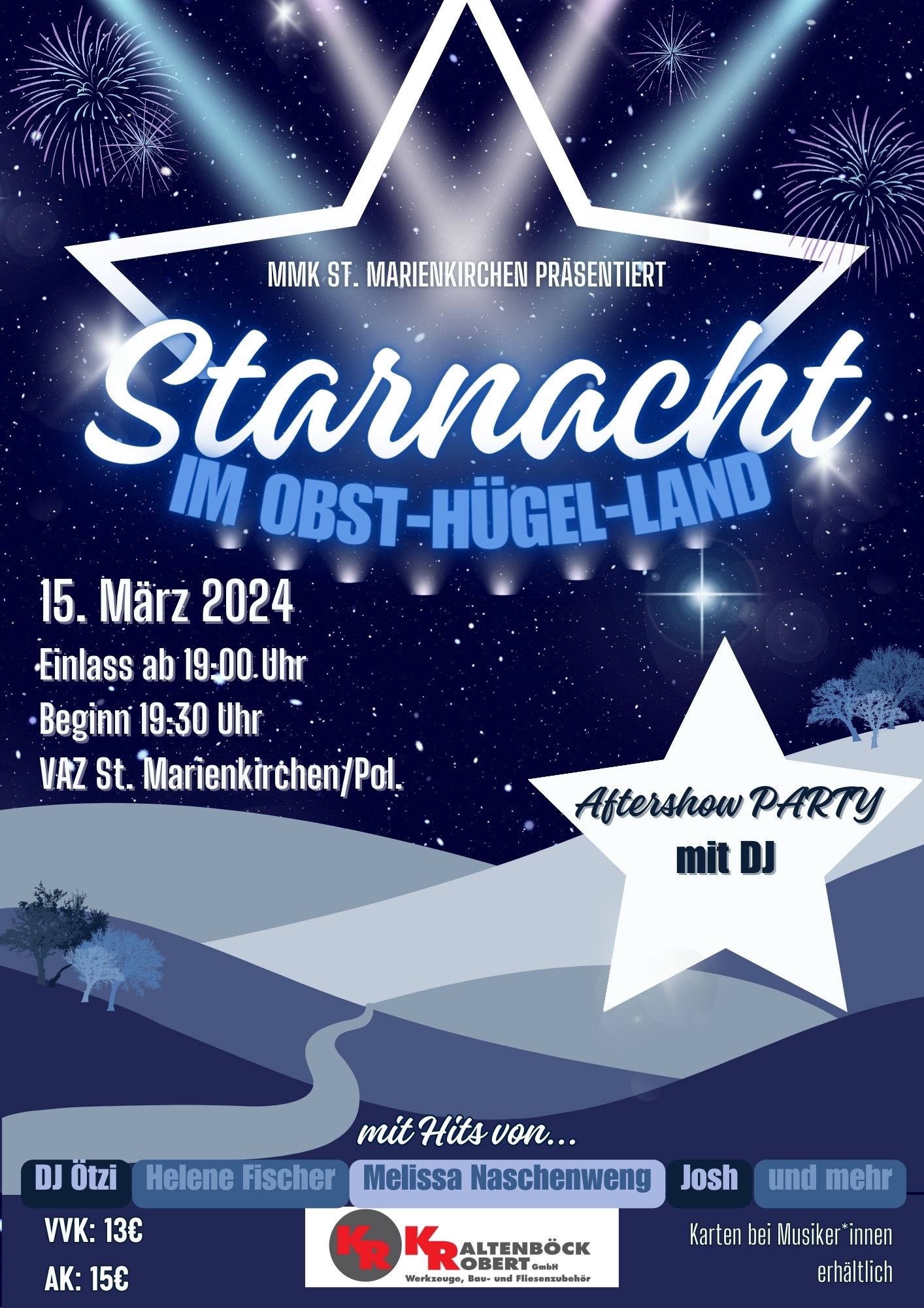 STARNACHT IM OBSTHÜGELLAND Am 15.03.2024 steigt im Veranstaltungszentrum St. Marienkirchen eine erstklassige Show mit den unverwechselbaren Hits von DJ Ötzi, Melissa Naschenweng, Andreas Gabalier und vielen mehr. Sichere dir deine Eintrittskarte zum VVK-Preis…